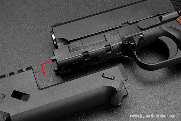 ストライクプレートを前方へ取り外す。ベース部にはダイキャストパーツが使用されており、フロントに重心が掛かるようになっていて、手にしたときのずっしり感はここからきている。重量増による射撃安定性にも一役買っているはずだ。